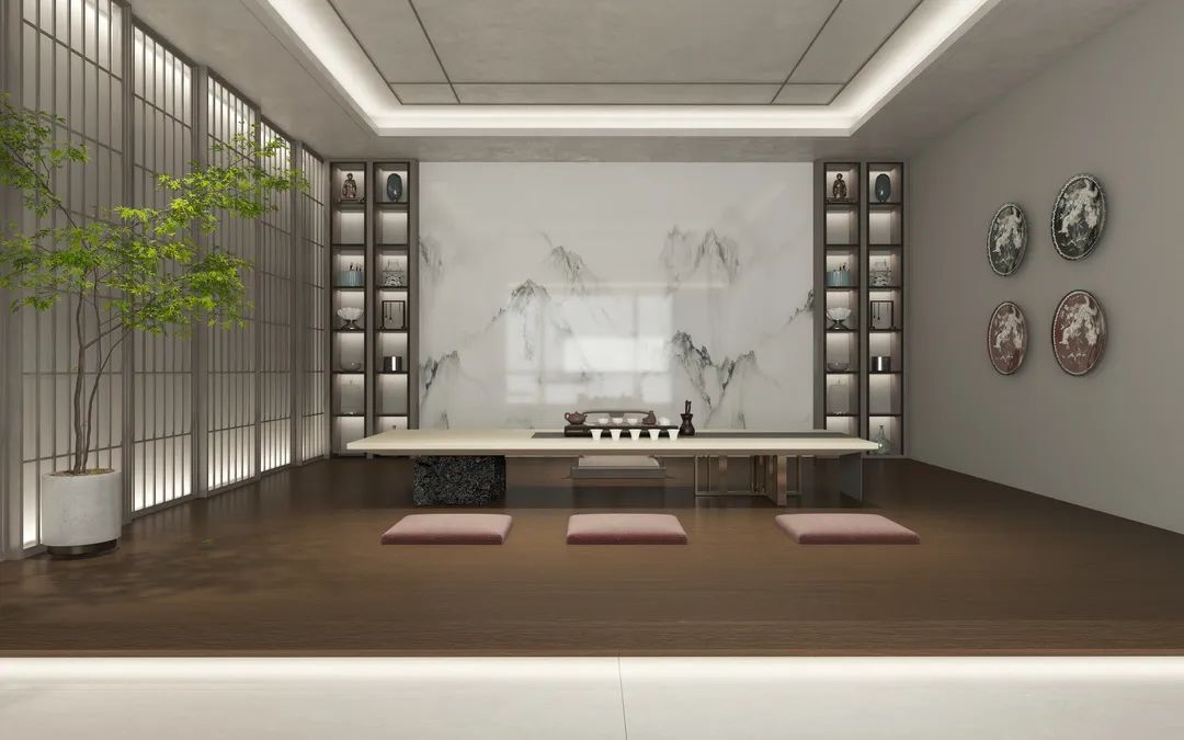 净室素静,深色地面表达沉稳也能抓住你的视觉焦点。从精神富足到落地实践,营造一种暂时排外静思的冷静氛围。