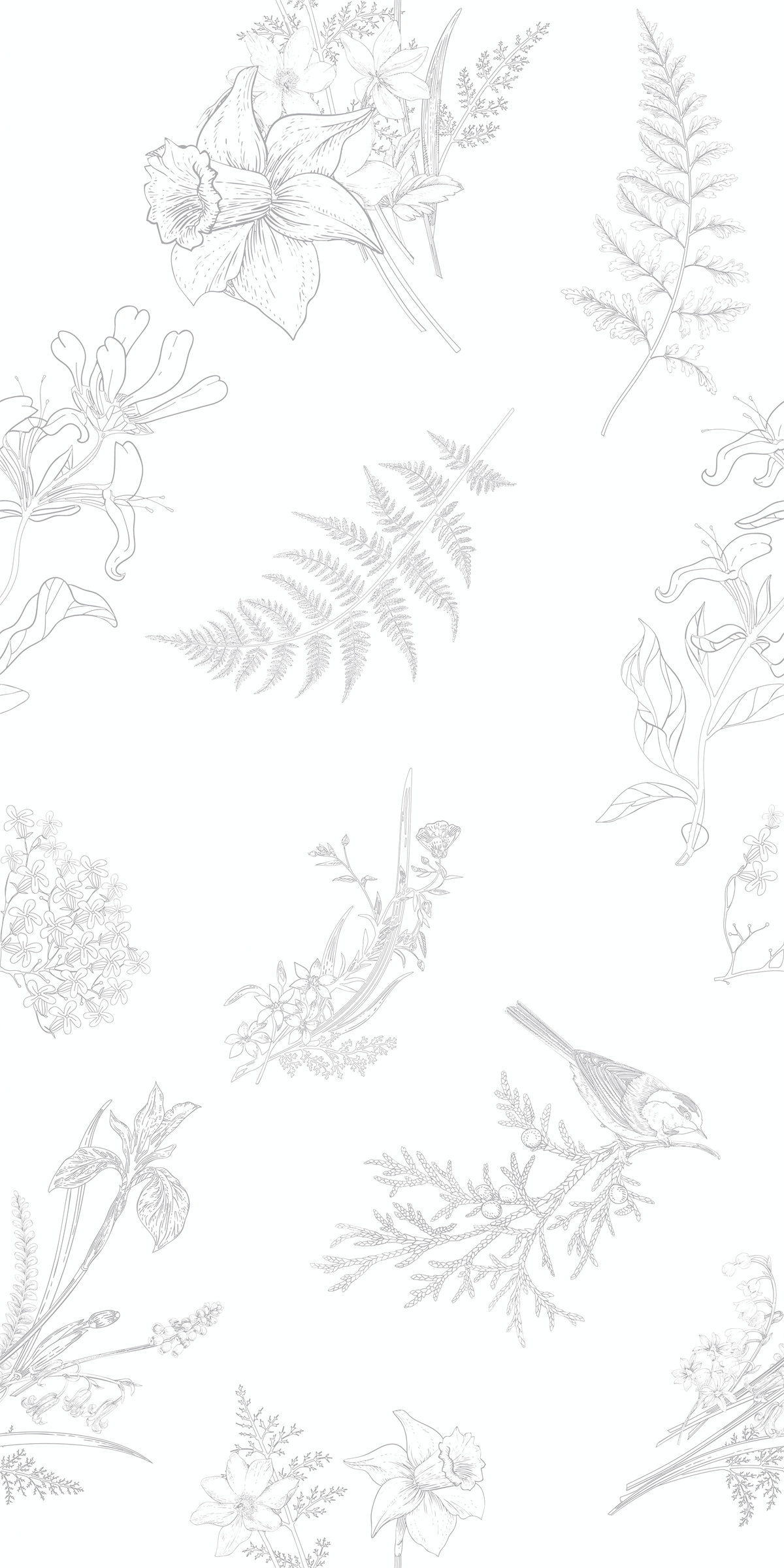 线描呈现小鸟、山茶与蕨叶,元素自然散布,融入庄周梦蝶的哲思与奇幻感。