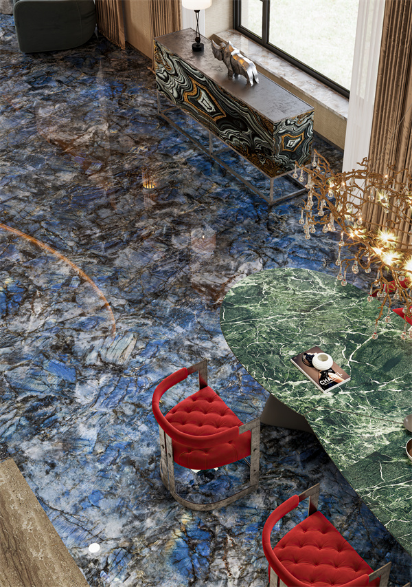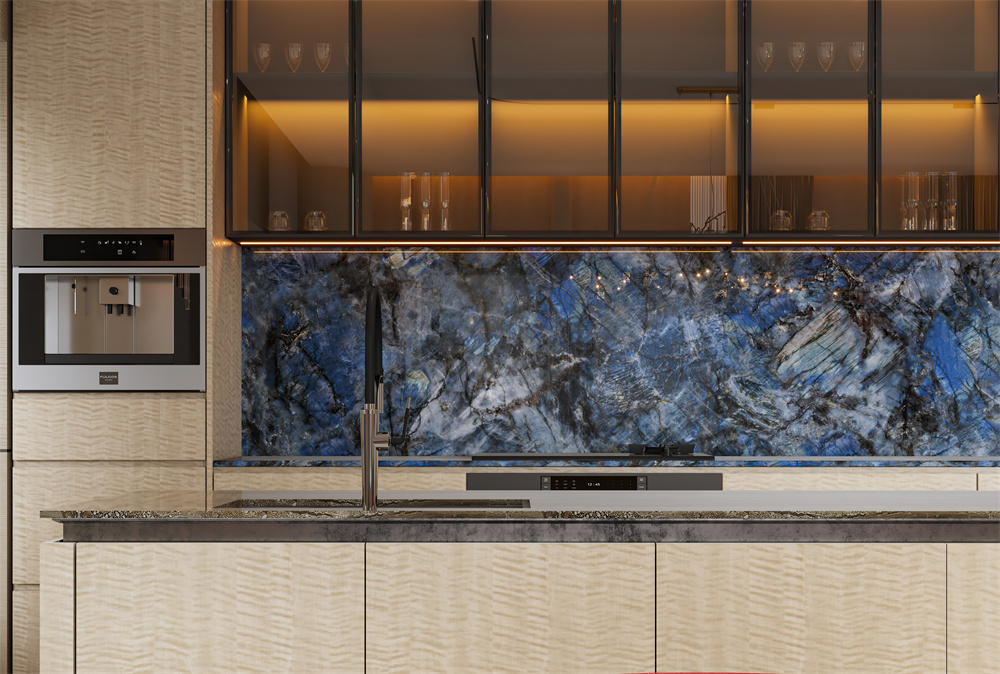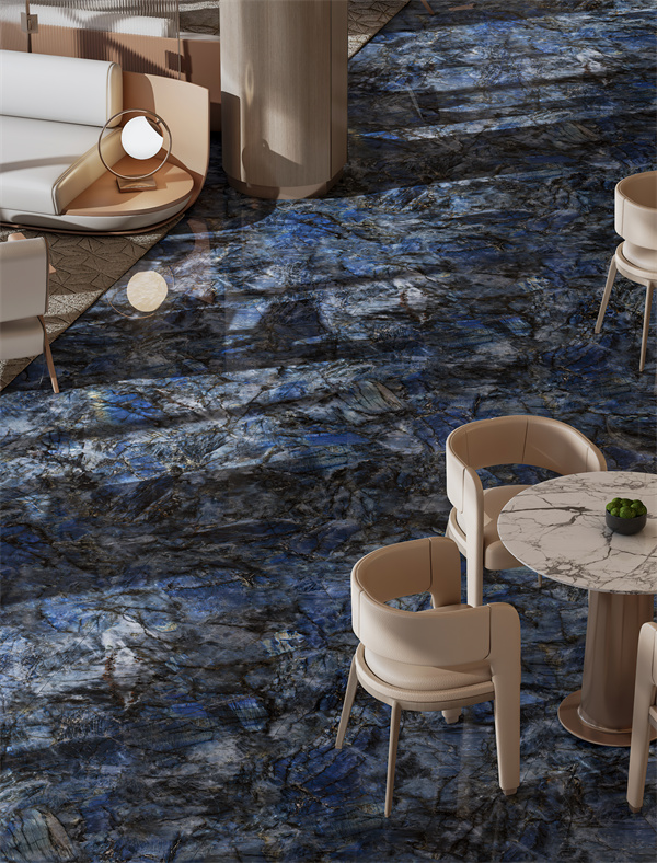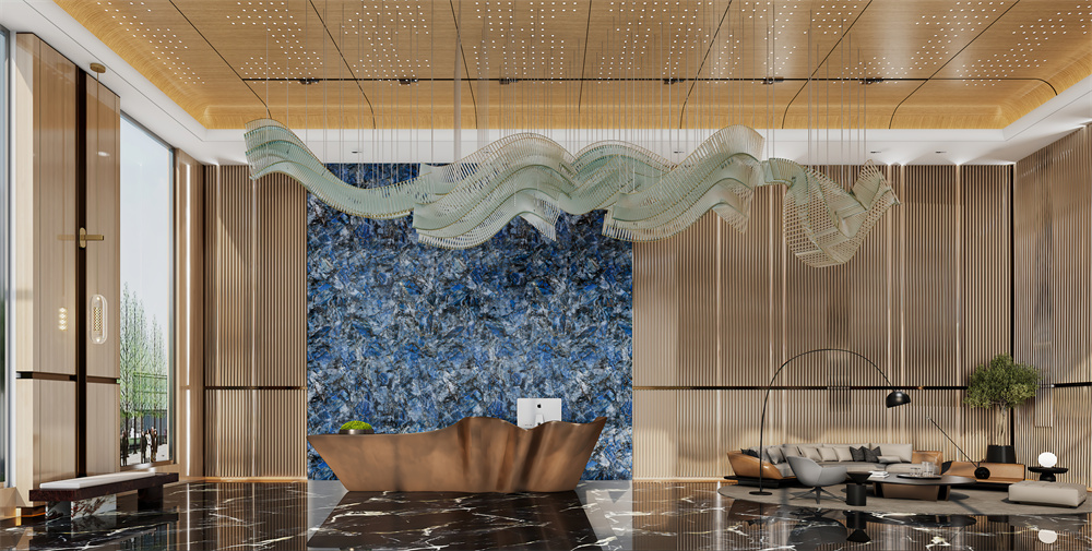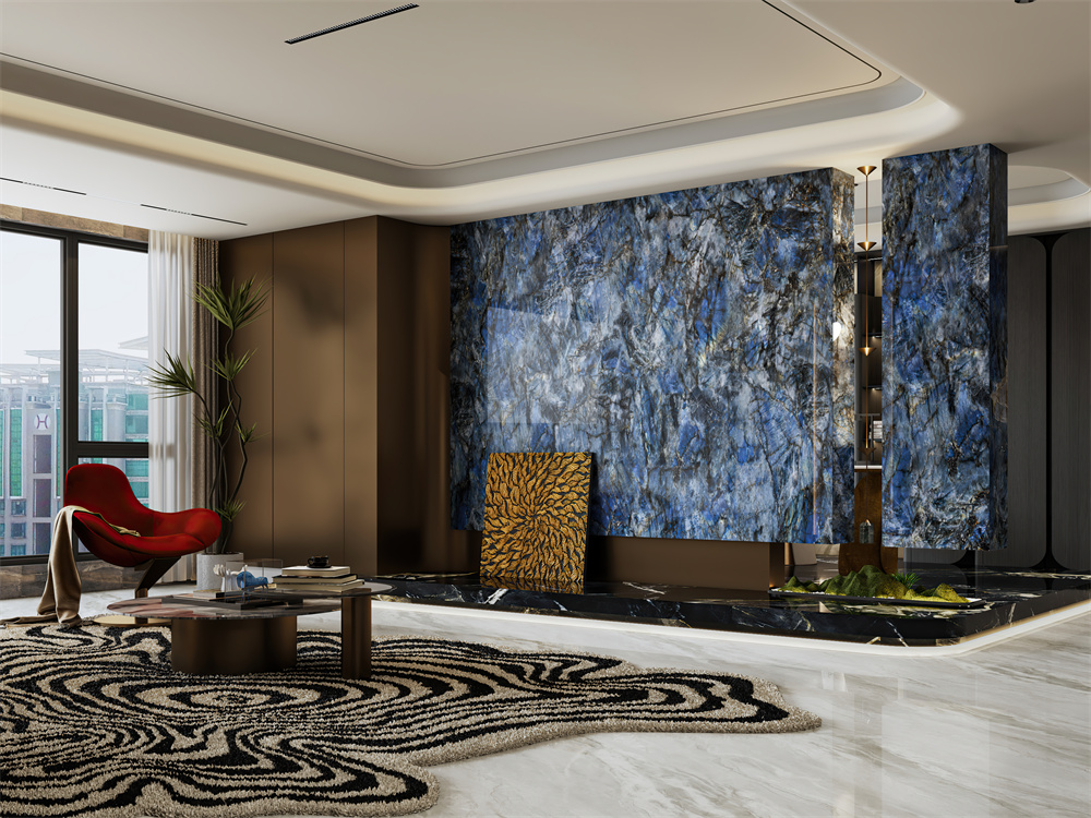 深邃钴蓝为底,璀璨晶光如星际尘埃悬浮,打造如银河降临般的艺术墙面。